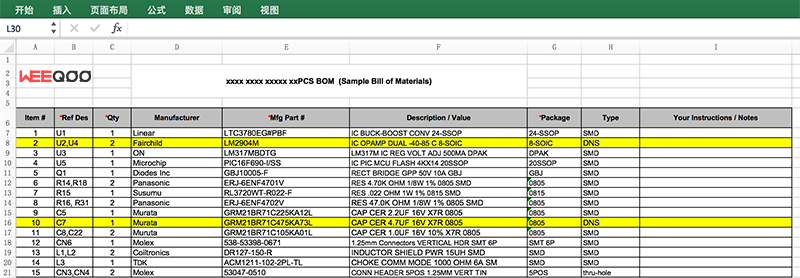 Please make sure your BOM includes designators (references), quantity, package type, and part numbers. For resistors or capacitors, if there are no part numbers, please provide their values and package information instead. It’s also helpful to specify whether each component is PTH or SMD . For reference, you can check our sample BOM file to confirm the proper format.